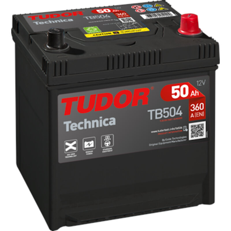Diseñada para el arranque de motores diésel y gasolina de alta cilindrada. batería tudor TB504 12v 50ah 360en derecha. dimensiones aproximadas 200x173x222. tapa doble termo sellada para mayor seguridad. filtro anti llamas para evitar deflagraciones. placas de metal expandido 3dx con alta resistencia a la corrosión. aditivos de carbono para reducir una posible sulfatación de las placas. salida centralizada de gases.
