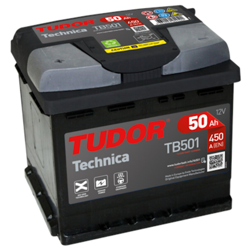 Diseñada para el arranque de motores diésel y gasolina de alta cilindrada. batería tudor TB501 12v 50ah 450en izquierda. dimensiones aproximadas 207x175x190. tapa doble termo sellada para mayor seguridad. filtro anti llamas para evitar deflagraciones. placas de metal expandido 3dx con alta resistencia a la corrosión. aditivos de carbono para reducir una posible sulfatación de las placas. salida centralizada de gases.
