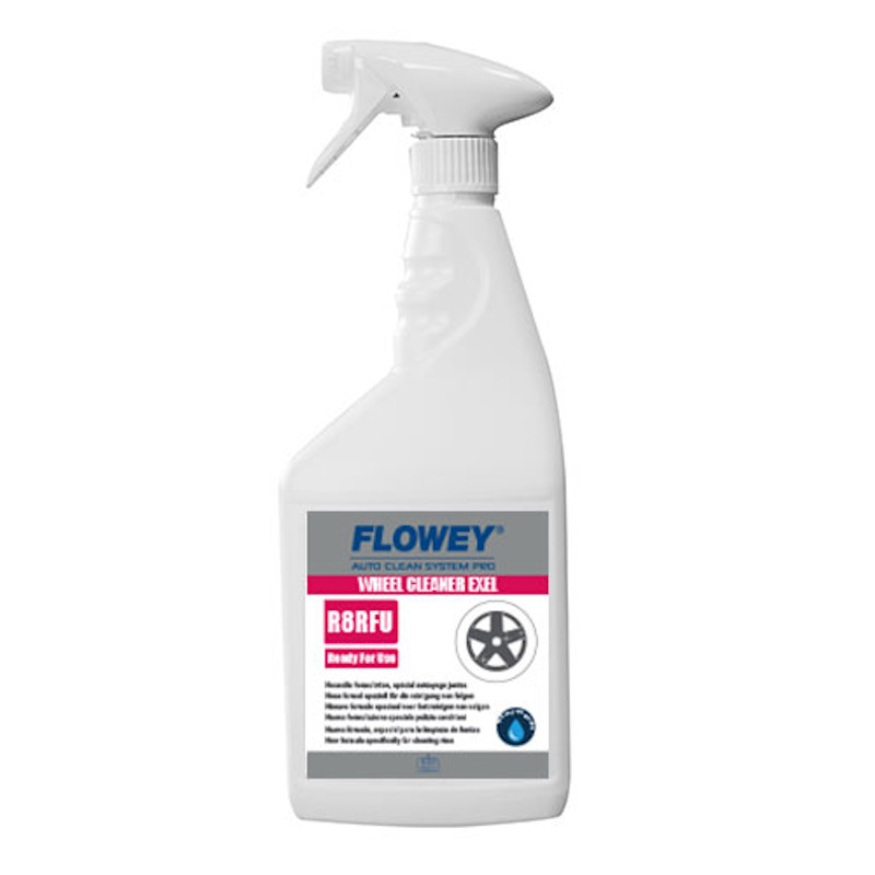 R8 FLOWEY WHEEL CLEANER EXEL. Alta capacidad detergente de agentes tensoactivos. La combinación de agentes complejantes y dispersantes de nueva generación mejora considerablemente la calidad de la limpieza de las llantas. Favorece el trabajo de los tensoactivos al separar la suciedad de las llantas, de modo que se refuerza la potencia limpiadora. Limpia fácilmente todas las llantas de acero y aluminio y los embellecedores. Elimina la suciedad y el polvo de los frenos y hace que las llantas recuperen su aspecto original. Puede aplicarse con pulverizador o en instalaciones automáticas de lavado de vehículos. Funciona con aguas duras y blandas.