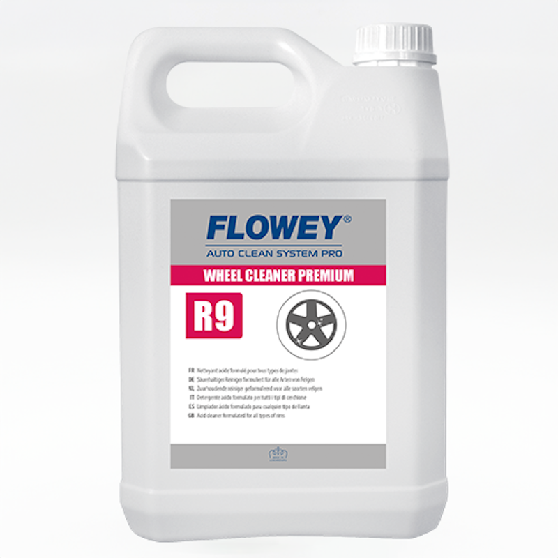 R9 FLOWEY WHEEL CLEANER PREMIUM es un producto ácido formulado especialmente para poder emplearse sobre cualquier tipo de llanta, incluidas las de aluminio. Gracias a sus ingredientes rigurosamente seleccionados, Wheel Cleaner Premium actúa como tensoactivo, desincrustante y desoxidante. Permite eliminar rápidamente el polvo de los frenos y cualquier suciedad, incluso la más incrustada en las llantas.