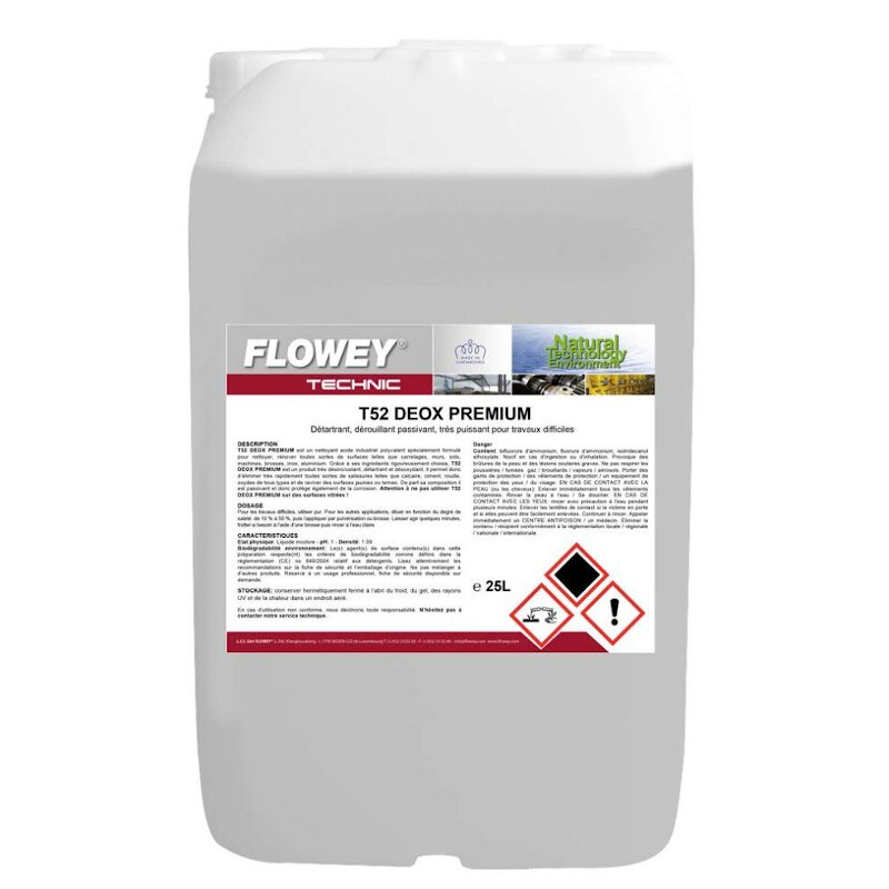T52 FLOWEY DEOX PREMIUM. Es un limpiador ácido industrial polivalente, especialmente formulado para limpiar y renovar cualquier superficie (azulejos, paredes, suelos, maquinaria, cepillos, acero inoxidable, aluminio). Permite eliminar rápidamente todo rastro de cal, cemento, herrumbre u óxido de cualquier tipo, y restaurar superficies amarillentas o parduzcas.